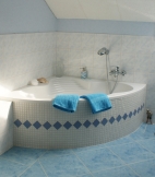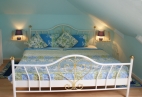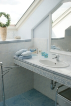 Weiter haben Sie hier 2 separate Schlafzimmer, eines mit weißem Doppelbett das andere Zimmer mit zwei Einzelbetten. Zu dieser Suite gehört ein hellblau gestaltetes Badezimmer mit Rundbadewanne.